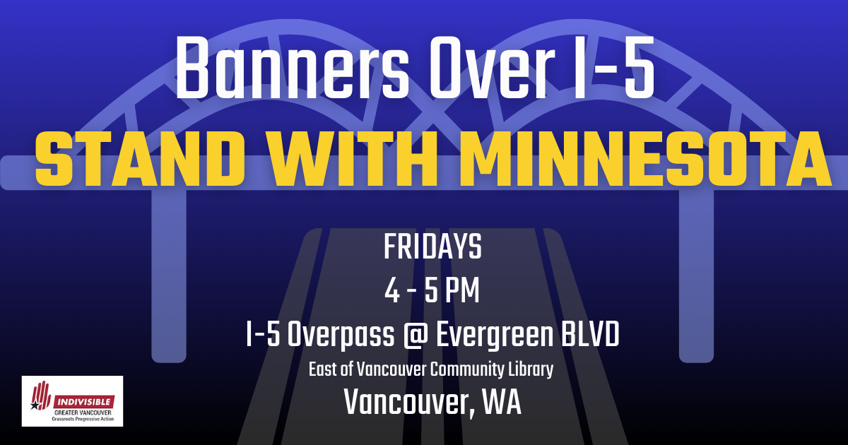 We’re making a bold, visible stand to defend our democracy and push back against the Trump administration’s illegal and unconstitutional actions. During peak commuting hours, we’ll raise our banners high over I-5 to show that our community is awake, united, and ready to fight for what’s right.